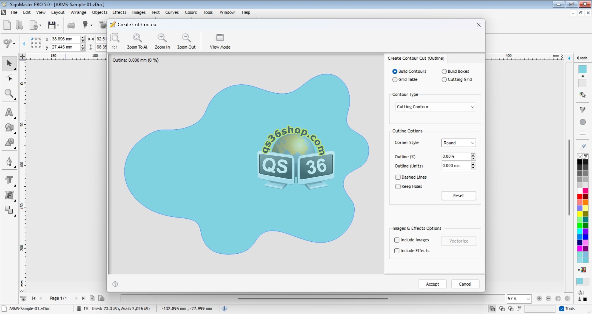 • Design & Layout Tools: Provides advanced tools for creating outlines, inline, drop shadows, and distortions (e.g., arch, flag, cylinder). It includes automated tools like nesting, tiling, and array functions.